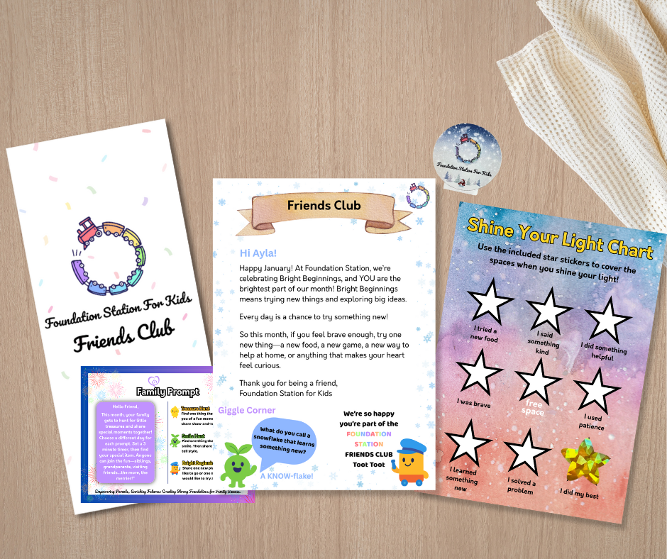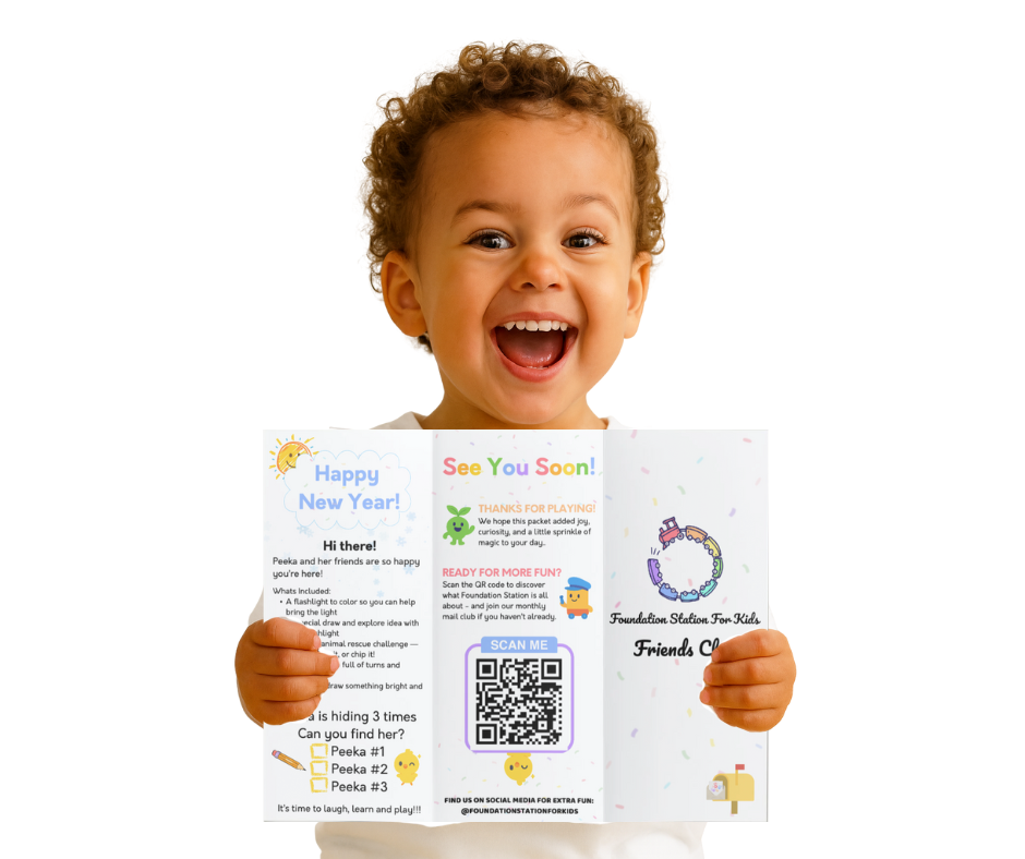 We created Foundation Station to help families reclaim those moments. Each month, your child receives mail addressed directly to them with a personalized letter, fun activities, colorful stickers, and prompts designed to spark meaningful family conversations.